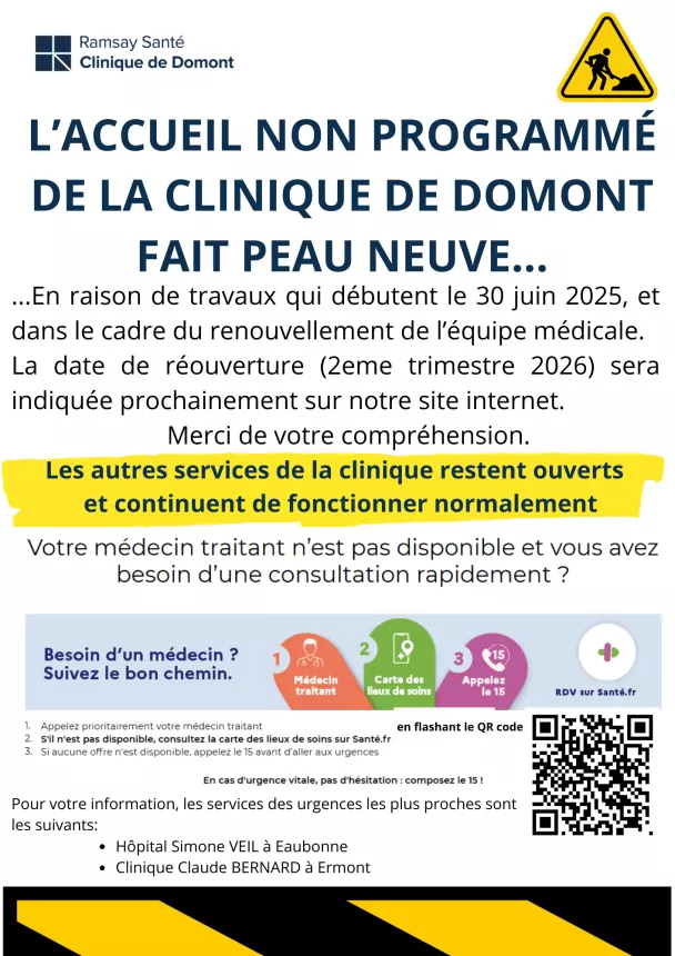 L'accueil non programmé de la clinique fait peau neuve, en raison de travaux qui débutent le 30 juin 2025 et dans le cadre du renouvellement de l'équipe médicale.